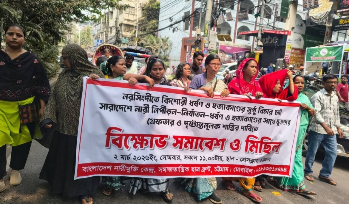 নিজস্ব প্রতিবেদক: নরসিংদীতে কিশোরীকে ধর্ষণ ও হত্যাকাণ্ডের সুষ্ঠু বিচার ও সারাদেশে অব্যাহত নারী শিশু নির্যাতন ধর্ষণের দ্রুত বিচার নিশ্চিতের দাবিতে বাংলাদেশ নারীমুক্তি কেন্দ্র ও সমাজতান্ত্রিক ছাত্রফ্রন্ট এর বিক্ষোভ সমাবেশ অনুষ্ঠিত …